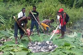 Lubang digali, batu dibakar, babi dipanah. Ratusan lelaki berlarian berkeliling memanggul babi, ratusan lelaki dan perempuan lain berlarian membawa daun singkong, daun pakis, dan dedaunan lain. Para perempuan, sanak saudara, yang lama tak bersua melepas rindu dengan bersenda-gurau. Para gadis saling menggoda, sementara ibu-ibu mengupas ubi atau menjaga bayi mereka. Persiapan pesta yang riuh.